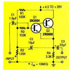 Este circuito tem uma impedância de entrada de 10 M ohms. Encontramos na revista Electronics Now de outubro de 1993. O circuito usa transistores comuns de uso geral.