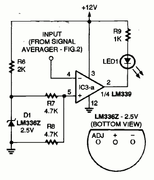Este circuito para indicador com LED usa um comparador LM339. O circuito foi encontrado na revista Electronics Now de janeiro de 1995. A fonte de alimentação é simples.