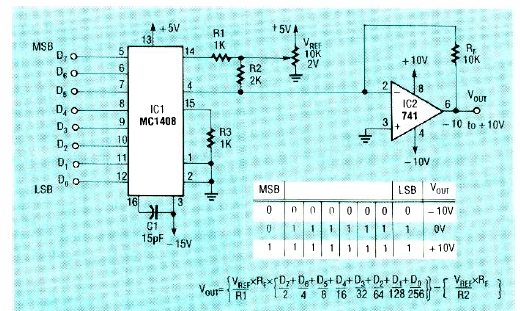 Este circuito de conversor digital para analógico foi encontrado na revista Radio Electronics de julho de 1991. O operacional converte a corrente de saída em tensão.