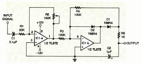 Este circuito pode ser usado em indicador de nível de sinal com LEDs. O circuito é de uma Electronics Now de janeiro de 1996. A fonte de alimentação deve ser simétrica.