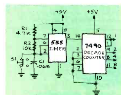 Este circuito funciona com o anterior gerando os pulsos de contagem para sorteio aleatório. O circuito é de uma Radio Electronics de novembro de 1983. A alimentação deve ser feita com 5 V.