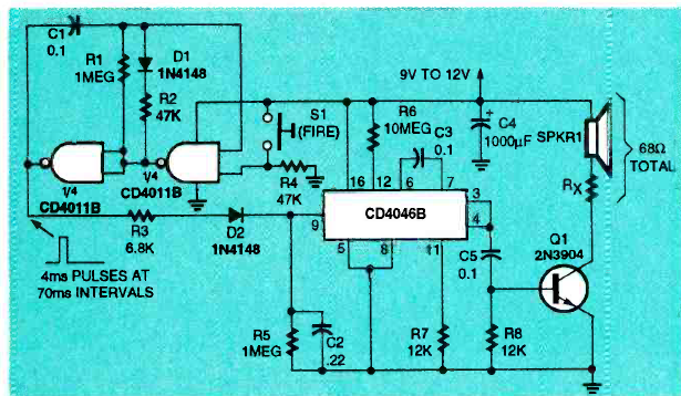 Usando um PLL 4046, pouco comum atualmente, este circuito foi encontrado na revista Electronics Now de outubro de 1994. A potência é dada pelo transistor e é pequena neste caso.