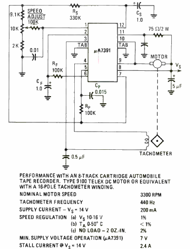 Este controle de velocidade para motor com sensor tacométrico foi encontrado na Radio Experimenter Special Projects de 1993. A corrente máxima é de 2,4 A.
