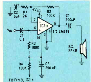Este amplificador de áudio foi encontrado na revista Radio Electronics de julho de 1984. A tensão de alimentação e a potência devem ser procuradas no datasheet do componente.