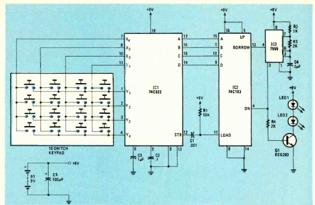 Este circuito para um transmissor infravermelho de 16 canais foi encontrado na revista Radio Electronics de agosto de 1984. O circuito funciona com bateria de 9 V.
