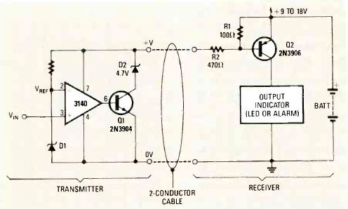 Com este circuito é possível conectar um comparador a uma etapa de potência através de dois fios. O circuito pode ser usado como um monitor de tensão, por exemplo.