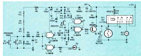 Encontramos este circuito na revista Radio Electronics de maio de 1990. O circuio tem alimentação de acordo com o relé utilizado e utiliza sensores tanto normalmente abertos como normalmente fechados.