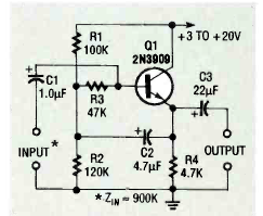 Este circuito com saída de baixa e impedância e 900k de impedância de entrada foi encontrado na revista Electronics Now de outubro de 1993. Q1 é de uso geral.