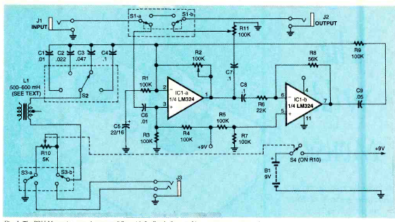 Este circuito foi encontrado na revista Electronics Now de setembro de 1999. O circuito tem por base operacionais comuns e produz diversos efeitos para o som de guitarras.