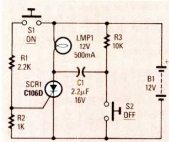 Este circuito usa um capacitor para reduzir por um instante a tensão entre anodo e catodo do SCR para o desligamento. O circuito é um dos muitos semelhantes encontrados nesta seção. Saiu na revista Radio Electronics de setembro de 1987.