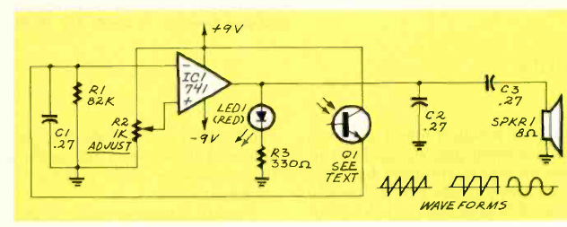 Este pequeno gerador de sons foi encontrado na revista Radio Electronics de novembro de 1987. O fototransistor é comum e ele comanda os sons gerados. A frequência básica é dada por C1.