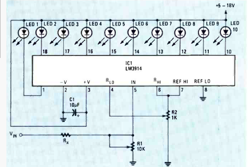 Na figura temos o modo de se usar o bargraph LM3914 com escala expandida. O circuito tem dois ajustes determinando os extremos da escala de excitação dos LEDs.