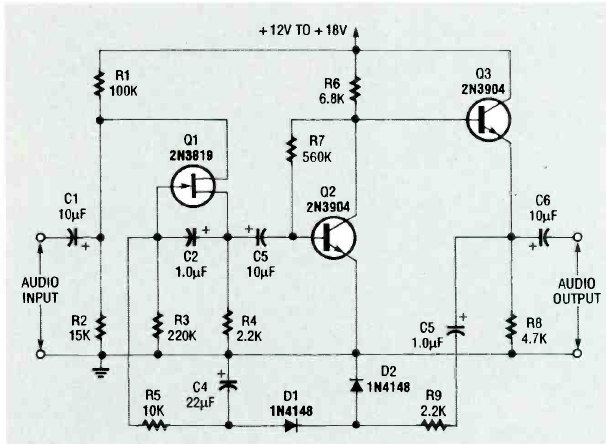 Um JFET é empregado neste circuito para manter o ganho constante. O circuito é de uma Electronics Now de abril de 1993. O circuito pode usar qualquer JFET e os demais transistores são de uso geral.