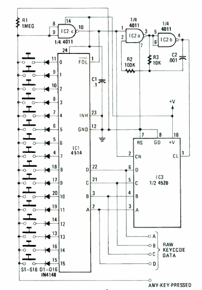 Este circuito foi encontrado na revista Radio Electronics de julho de 1987. Ele utiliza tecnologia CMOS para converter em binário o controle de 10 interruptores de pressão.
