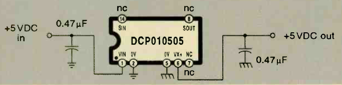 Este circuito isolado converte 5V em 5V x 50 mA com isolamento de até 1 000 V. Encontramos na revista Electronics Now de agosto de 1998. O circuito integrado usado é pouco comum em nossos dias.