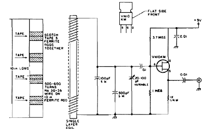 Este circuito para a faixa de 60 kHz foi encontrado na revista 73 e publicado em 1995. O circuito usa um bastão de ferrite. Observe o sentido dos enrolamentos das bobinas.