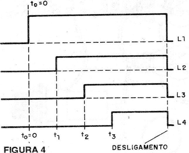 O capacitor C4 carrega-se, então, até ser atingida a tensão de disparo do último SCR que é SCR3, quando então acende a lâmpada L4.