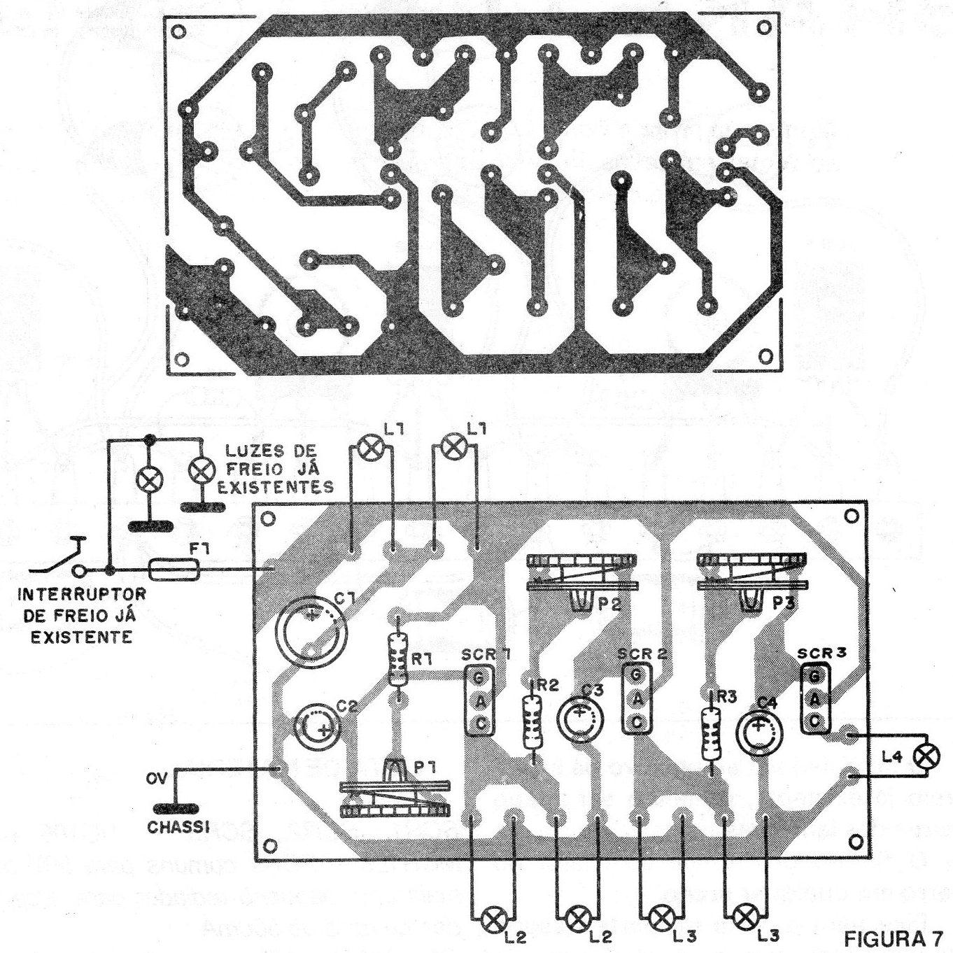 Obs. O artigo é de 1986 quando a Brake Light era novidade. O projeto usado usa lâmpadas, mas podemos facilmente substituí-las por LEDs com resistores de 470 ohms em série.