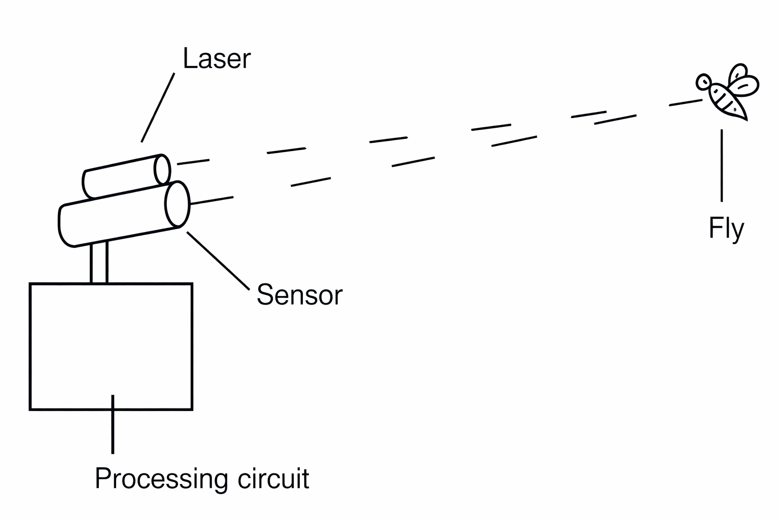 Quando a mosca é detectada, um laser é acionado, atingindo o inseto. É claro que os lasers de LED simples não seriam poderosos o suficiente para derrubar uma mosca, então lasers de hélio-neon (HeNe) ou ainda mais poderosos devem ser usados (com muito cuidado, é claro).