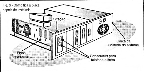 A placa do modem é feita de tal forma que, ao ser encaixada num slot livre, pode ser fixada por meio de um parafuso na caixa da unidade de sistema mantendo-se firme em posição de funcionamento. Esta fixação também torna acessível os terminais de ligação da linha telefônica e de um telefone, veja a figura 3.