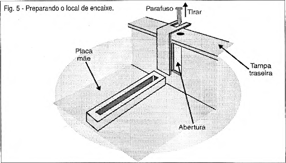 c) Aberta a unidade, verifique em que slot livre o modem pode ser instalado. Retire então a tampa que existe na parte traseira defronte a este slot de modo que ele possa ser fixado, figura 5.