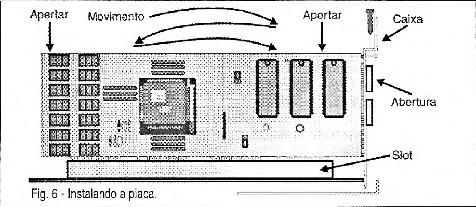 O encaixe deve ser feito movimentando-se a placa da forma indicada na figura 6, apertando-a no sentido vertical e nunca lateralmente, pois isso pode causar rompimentos de trilhas ou problemas mais graves.