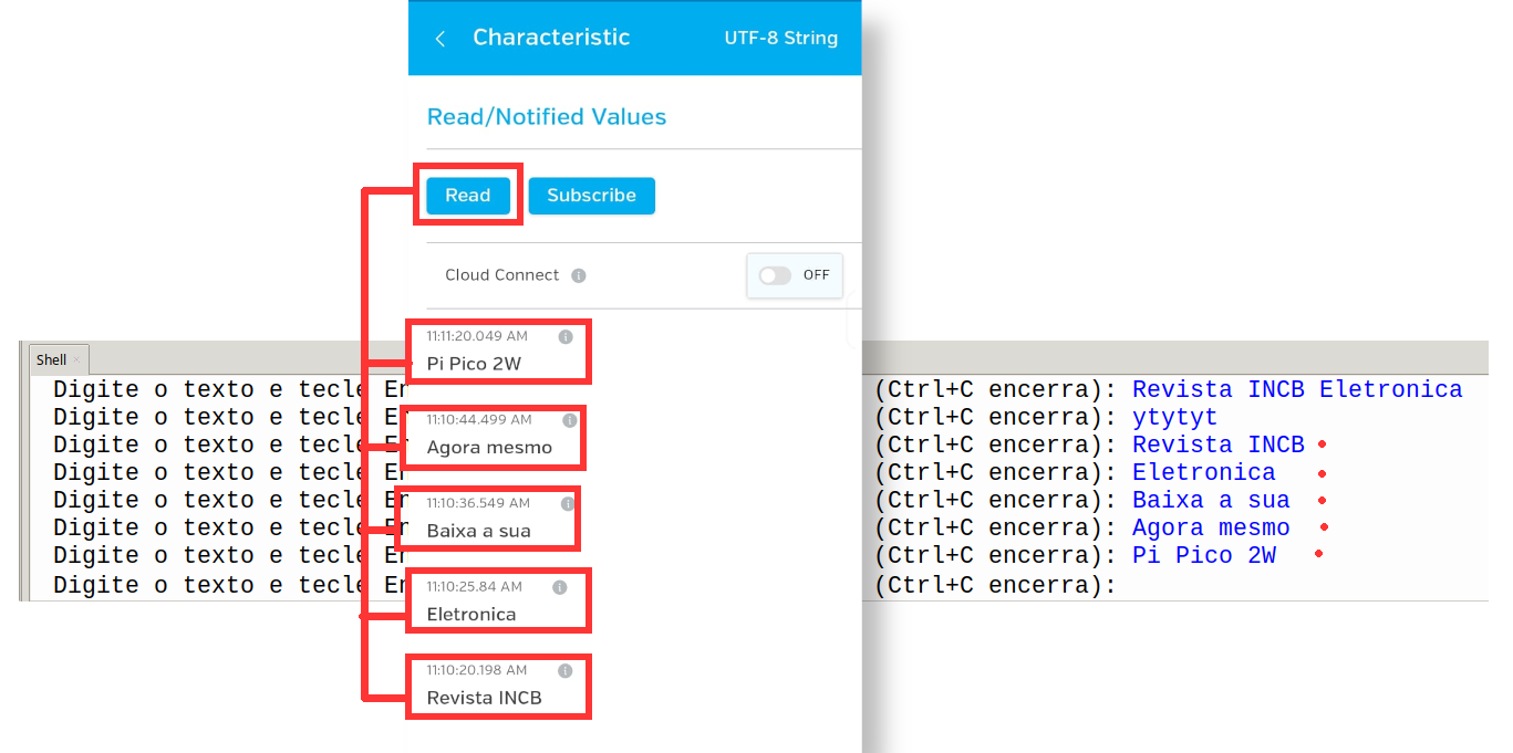 Para enviar os dados, faça como na figura 3, onde digitamos uma frase que será enviada pela Pi Pico 2W para o aparelho celular, mas ele será exibido na tela se pressionarmos o botão "Read".