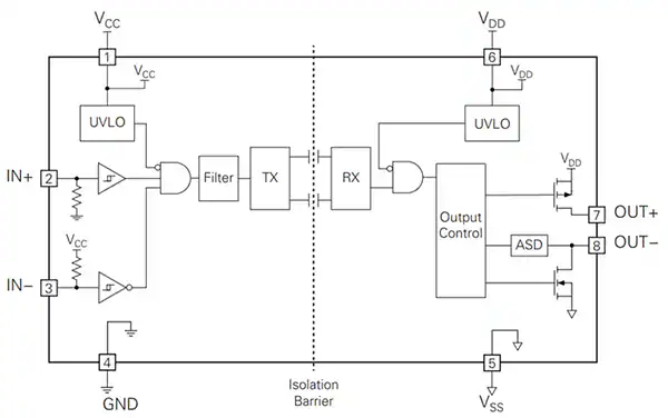 O Driver de Porta Isolado de Canal Único IXYS IX3407B fornece uma corrente de saída de pico típica de 7 A na fonte e no dreno em pinos de saída separados. O isolamento galvânico de entrada e saída é fornecido por uma técnica de isolamento em que a matriz transmissora de baixa tensão e a matriz receptora de alta tensão são isoladas por capacitores de alta tensão integrados. As entradas lógicas do IXYS IX3407B são tolerantes a tensões de entrada de até VCC e empregam limites de tensão TTL para suportar uma ampla gama de dispositivos lógicos de controle alimentados com tensões de até 3,3 V. O circuito de Bloqueio por Subtensão (UVLO) protege tanto a entrada quanto a saída. Um recurso de desligamento ativo também protege o transistor de potência, puxando-o para OUT-low em caso de perda de tensão na saída.