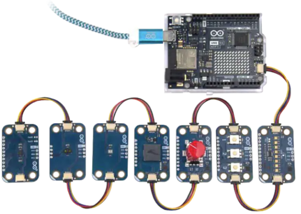 O Arduino UNO R4 WiFi® integra microprocessadores poderosos com recursos como comunicação de baixa energia Wi-Fi®/Bluetooth®, um conector Qwiic, um DAC e uma grande matriz de LED. Os nós Modulino são uma coleção de sensores e atuadores compatíveis com Qwiic (I2C) projetados para otimizar as conexões de hardware.
