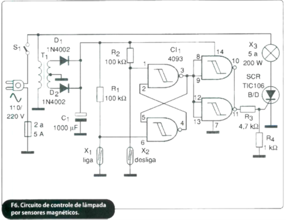 O circuito apresentado na figura abaixo controla uma lâmpada incandescente de alta potência (até 200 W) a partir do comando pulsos produzidos por dois sensores do tipo reed, ou ainda microswitches.