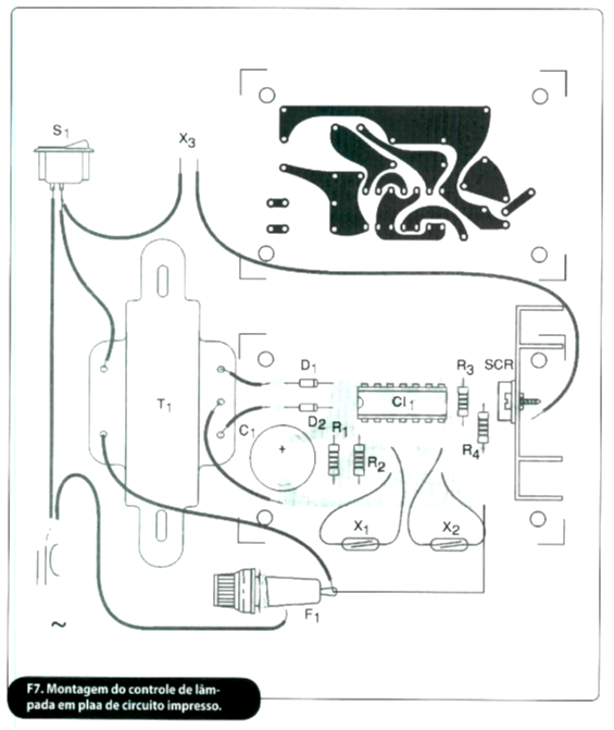 Evidentemente, como o setor de controle de baixa tensão tem pontos comuns com o circuito de alta tensão que controla a lâmpada, os sensores devem ser isolados, pois podem provocar choques em caso de toque acidental. Na figura 7 temos uma sugestão de placa de circuito impresso para implementação desse projeto.