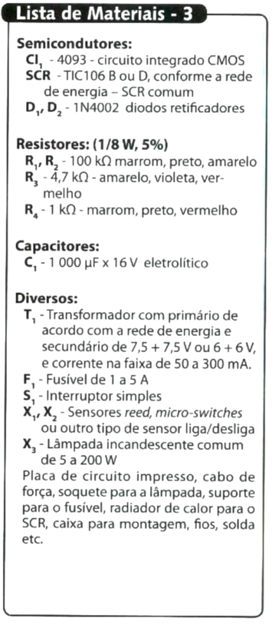 O SCR deve ter sufixo B ou D conforme a tensão da rede de energia, e o transformador é do mesmo tipo recomendado nos projetos anteriores. O SCR deve ser dotado de um radiador de calor, de acordo com a potência da lâmpada controlada. Observamos que, como os demais circuitos, trata-se de um controle de meia onda com a lâmpada acendendo com brilho abaixo do normal. Para um brilho maior, uma ponte retificadora pode ser agregada ao sistema de controle da lâmpada.