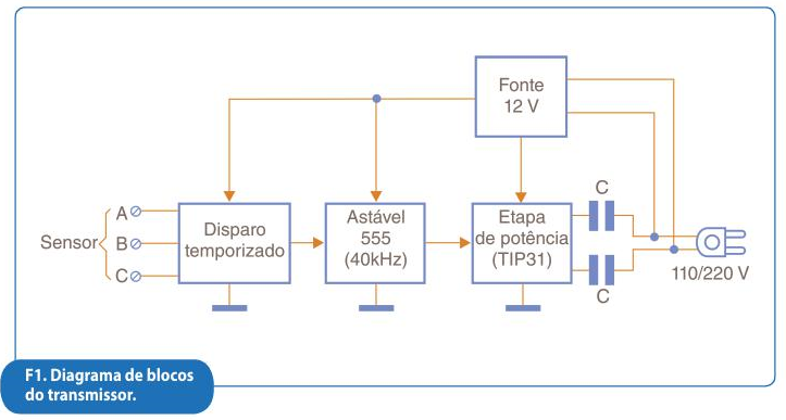 O sinal deste oscilador é levado a uma etapa de potência que consiste em um transistor TIP31 capaz de produzir uma saída de algumas centenas de miliwatts que é aplicada diretamente à rede local via capacitor C2. Este capacitor, assim como C1, é um elemento importante do transmissor, pois deve apresentar uma baixa impedância ao sinal, acoplando-o diretamente à rede. Recomendamos a utilização de capacitores de poliéster com tensão de trabalho de pelo menos 400 V para o caso de rede de 110 V e de, pelo menos, 600 V se a rede for de 220 V.