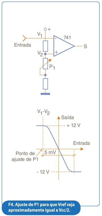 P1 fixa a tensão de referência na entrada não inversora. Assim, na condição de ausência de sinal, ajustamos P1 para que a tensão de referência seja aproximadamente metade da tensão de alimentação, ou um pouco menos, de modo que na saída tenhamos uma tensão positiva, mas muito próxima da transição para zero volts (figura 4).