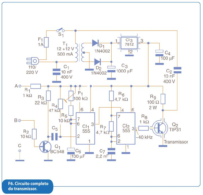 O transmissor tem um fusível de proteção em sua entrada e sua fonte de alimentação é estabilizada, tendo por sua base um integrado 7812, que deverá ser dotado de um radiador de calor.