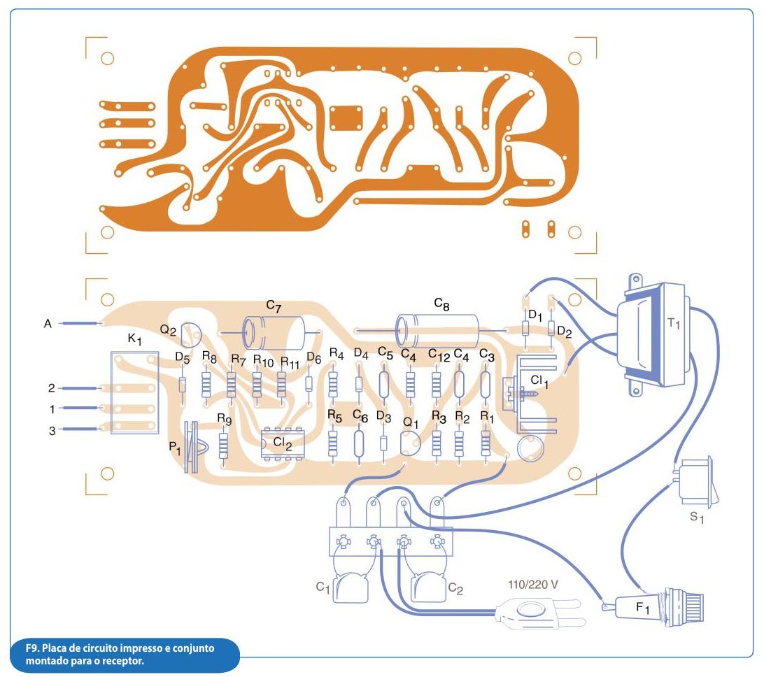O conjunto "placa + elementos externos" pode ser instalado em uma caixa plástica que deverá ficar próxima ao local protegido e ligada à tomada de força mais próxima. Na figura 8 vemos o circuito completo do receptor.
