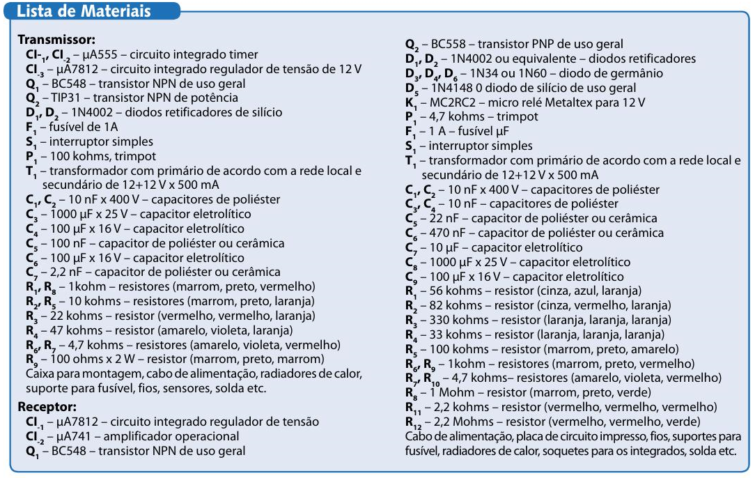 Os componentes, tanto do transmissor como do receptor, não são críticos. Os resistores são todos de 1/8 ou 1/4 W com 5% ou 10% de tolerância, exceto R9 do transmissor que deve ser de 2 W. O transistor Q2 (no transmissor) assim como os integrados 7812, tanto do transmissor como do receptor, deve ser dotado de radiadores de calor.