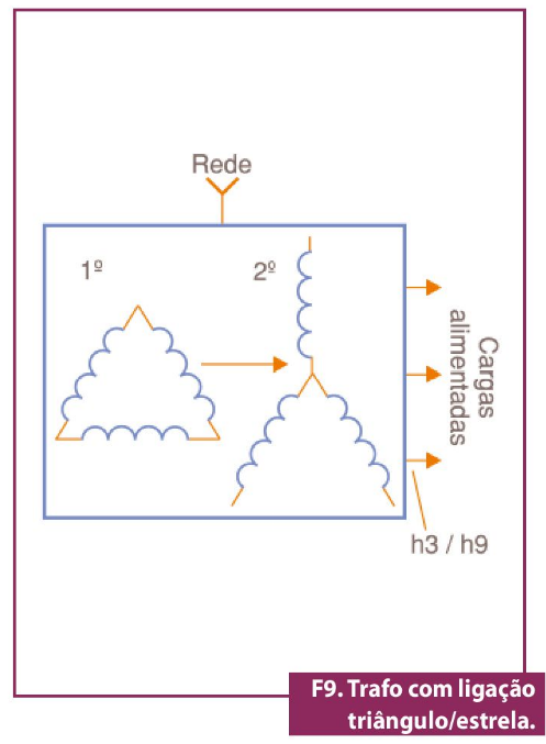 O modo como os enrolamentos de um transformador são ligados determina a ordem de bloqueio de certas harmônicas. Logo, temos duas possibilidades. Na primeira, mostrada na figura 9, um transformador com uma ligação triângulo/estrela é capaz de confinar ao trecho alimentado pelos secundários as terceiras harmônicas e suas múltiplas.