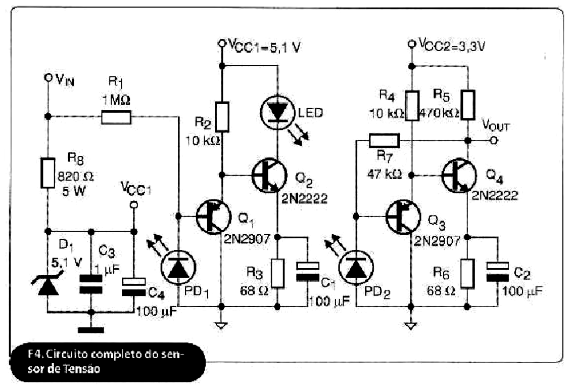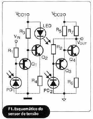 O presente trabalho propõe o projeto de um sensor de tensão que possua isolamento óptico, baixo custo e boa linearidade. Para tanto, foi escolhido o circuito integrado HCNR200 da Hewlett Packard, que é composto por um diodo LED AlGaAs e dois fotodiodos. O isolamento é adquirido graças ao acoplamento óptico que esse componente permite entre dois circuitos isolados.