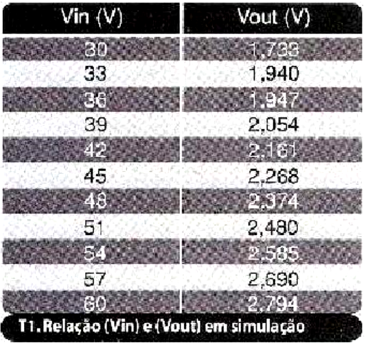 A partir do modelo SPICE disponível em Ref. [2], o circuito foi simulado. A tabela 1 compara tensões de entrada (Vin) e a resposta na saída (Vout), obtidas via simulação.