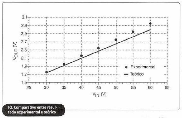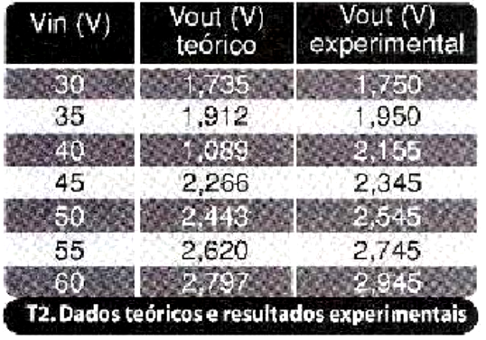 A tabela 2 compara as respostas da simulação com as do experimento, essas são demonstradas graficamente na figura 2. A diferença entre elas cresce com o aumento da tensão de entrada (Vin). Sob 30 V a leitura do protótipo foi 0.3% maior que o estimado pela teoria, enquanto sob 60 V a saída foi 4,9% superior ao esperado para esse ponto.