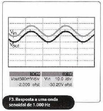 A fim de demonstrar a ausência de fase e a linearidade neste sensor, a entrada (Vin) foi submetida a um sinal senoidal de 1.000 Hz com 20 V pico a pico, e grampeamento de 48 V. Na figura 3 é apresentada a resposta do circuito. A onda superior refere-se à tensão de entrada (Vin), enquanto que a onda inferior está associada à saída (Vout).