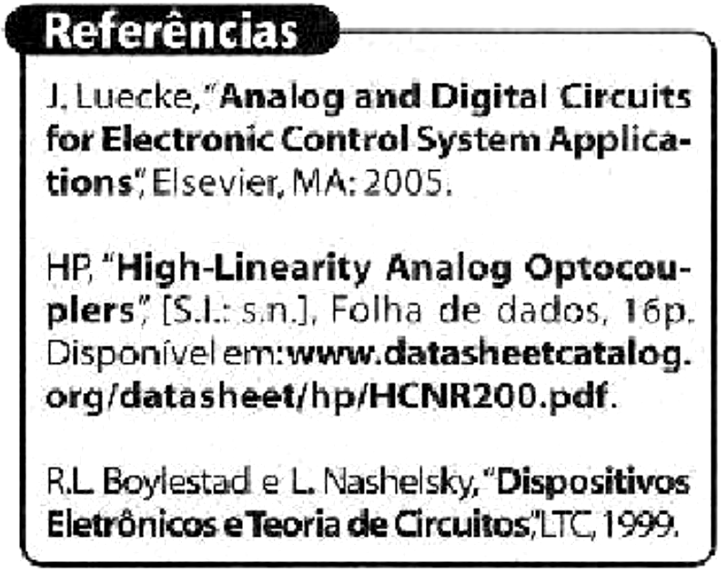 Após a escolha do método de isola- mento, iniciou-se a busca por um opto- acoplador que assegurasse linearidade satisfatória em suas aplicações. Como já citado, foi escolhido o circuito integrado HCNR200. Tendo como auxílio a Ref. [2], o esquemático exibido na figura 1 foi concebido. A partir de uma ferramenta computacional de simulação e da teoria de polarização de transistores, em Boylestad et al. [3], os componentes foram dimensionados para o circuito operar na faixa de tensão dos 30 V aos 60 V em regime de corrente contínua na entrada (VIN), com (VCC1 igual a 5 V e (VCC2) igual a 3,3 V.