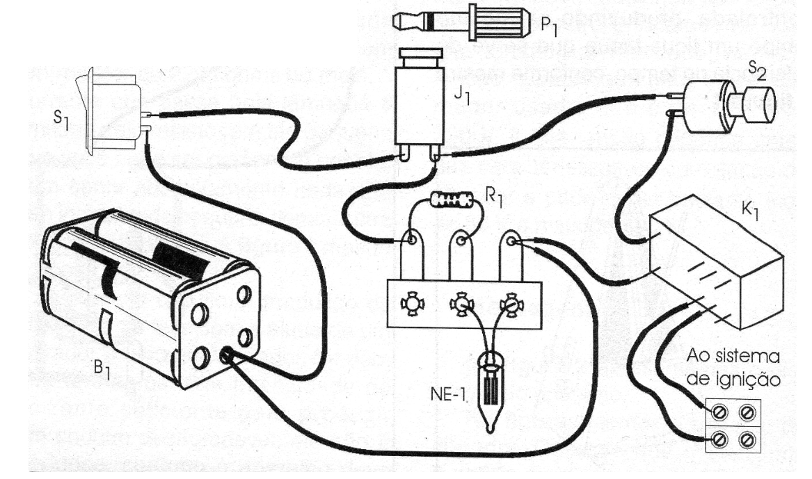 Desta forma, mesmo que algum “engraçadinho" feche S1, ou que ocorra seu acionamento acidental, sem a presença de P1 em J1 não é possível fazer o disparo. Na figura 1 temos o diagrama completo deste interessante sistema de segurança.