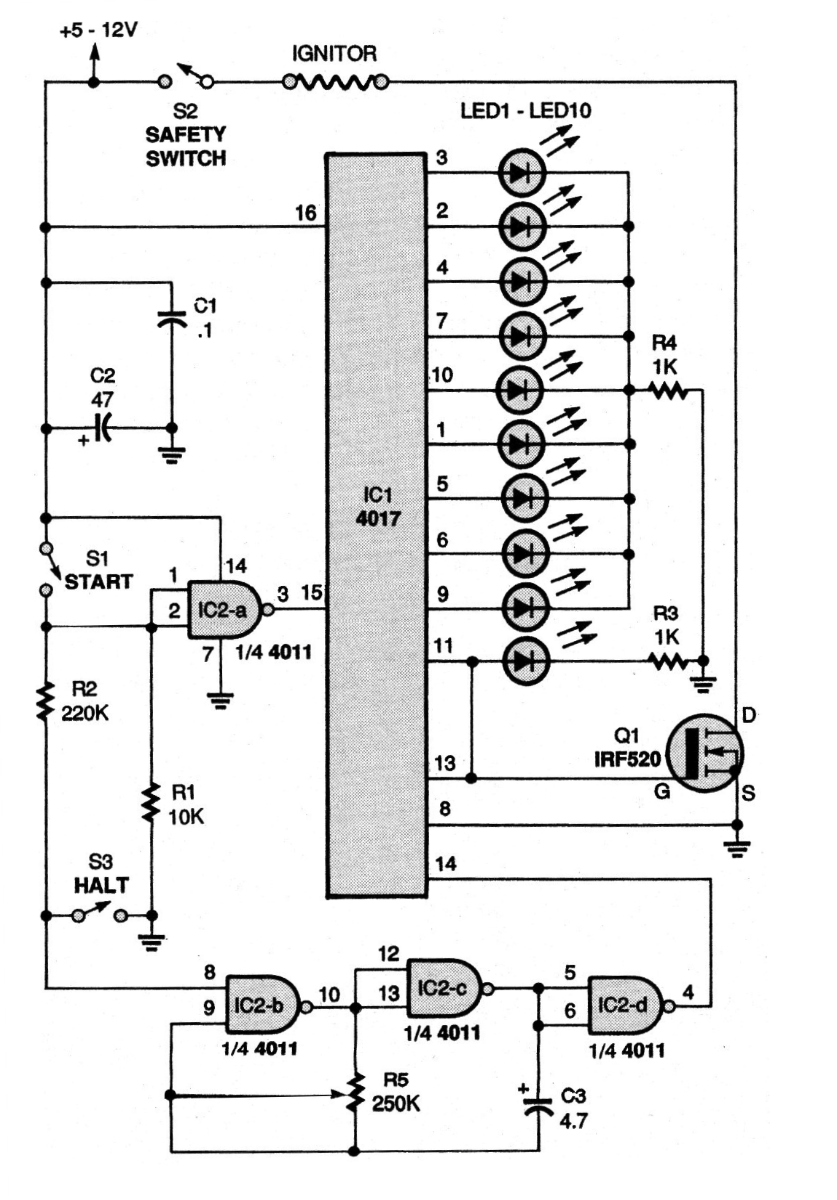 Este é um outro circuito interessante que pode ser elaborado para um lançador de foguetes. Baseado no contador CMOS 4017 ele faz a contagem regressiva disparando um MOSFET no final, o qual alimenta diretamente o resistor de ignição (Ignitor). O circuito é de uma antiga Poptronics e tem componentes comuns. O FET de potência pode ser d qualquer tipo. O circuito pode ser usado com outras finalidades e a alimentação de 5 a 12 V depende da ignição. Observe a existência de uma chave de segurança que, como no projeto anterior pode ser um plugue encaixado num jaque que, sem ele conectado não é possível haver o disparo, .mesmo que a contagem regressiva ocorra.
