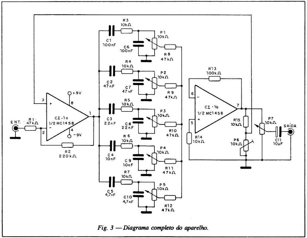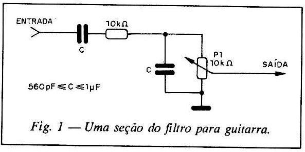 Efeitos para instrumentos musicais são muito apreciados pelos leitores que tocam algum instrumento de corda ou que participam de conjuntos. Os recursos eletrônicos em sua maioria são caros, mas com poucos componentes de baixo custo e um pouco de habilidade consegue-se às vezes resultados surpreendentes. O circuito que apresentamos aqui é muito interessante e ainda oferece a possibilidade de ampliação de suas faixas de ações com o acréscimo de módulos. Intercalando entre o captador de um instrumento musical e uni amplificador ele filtra determinadas faixas, aumentando ou diminuindo sua intensidade e assim realçando certas notas. O filtro que damos como exemplo opera na faixa dos graves principalmente, mas com a utilização de capacitores de 2,2 nF e 1 nF em dois módulos adicionais conseguimos também colocar os agudos, (figura 1). A alimentação de 9 V do circuito pode ser feita com baterias ou pilhas comuns e o baixo consumo garante uma boa autonomia para a fonte de alimentação.