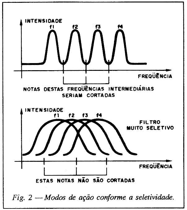 O sinal desta etapa é aplicado em 5 filtros cada qual contendo um potenciômetro de ajuste que permite controlar sua ação. A frequência de cada filtro é determinada basicamente pelos capacitores usados. No caso temos ações na faixa de 100 a 5 000 Hz, mas alterações podem ser feitas, lembrando que a faixa passante é relativamente larga pois os filtros não são de seletividade aguda, o que tomaria sua ação imprópria para este tipo de aplicação. Um filtro de grande seletividade selecionaria o espectro de áudio, impedindo a passagem de certas notas, (figura 2). O leitor que vai montar este circuito, pode até deixar em aberto os valores dos capacitores de Cl a C10, fazendo experiências de acordo com as características do instrumento usado.