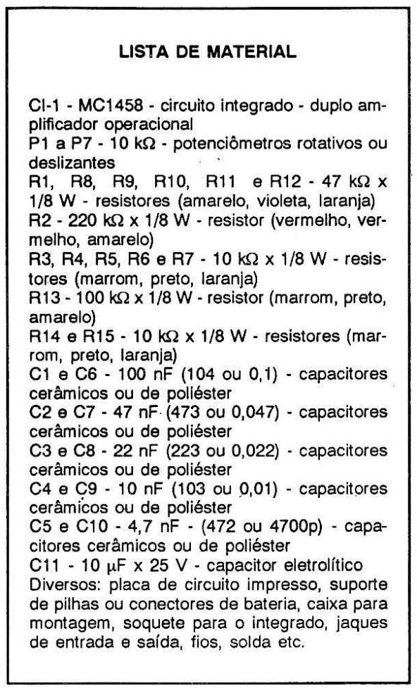 Os potenciômetros P1, P2, P3, P4 e P5 podem ser deslizantes para uma montagem com bom aspecto final, mas o uso de potenciômetros comuns não afeta o desempenho do projeto, o mesmo ocorrendo em relação a P6 e P7. Para a fonte de alimentação podemos usar pilhas ou baterias, se bem que pilhas mesmo sendo maiores, proporcionem maior autonomia para o aparelho. Suporte ou conectores apropriados devem ser usados para as pilhas ou baterias e a polaridade rigorosamente observada.