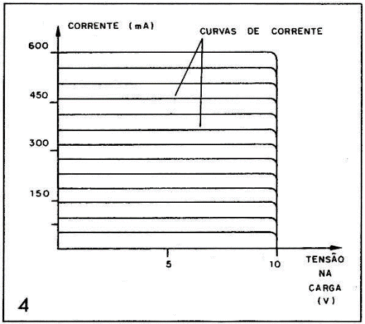 A tensão na saída se ajustará entre 0 e 10V aproximadamente, o que significa que podemos ter uma ampla faixa de resistências de carga para trabalhar, principalmente as que se situam na gama dos valores baixos, como vemos na figura 4.