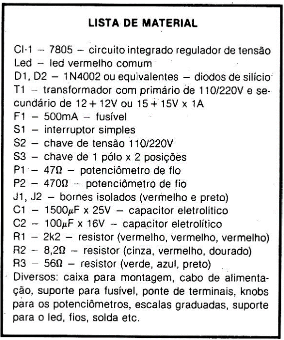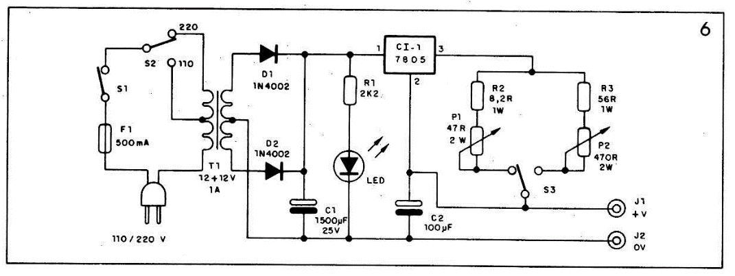 O integrado pode ser o 7805 ou 7806. No caso do 7806, partindo das explicações na parte inicial do artigo, devemos calcular os novos valores da escala. O resistor R1, que determina o brilho do led, é de 1/8 ou 1/4W, mas R2 e R3 devem ser resistores de 1W de carbono.